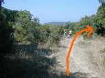 Ad uno spiazzo si tiene il sentiero di destra e subito dopo si prende una ulteriore traccia a destra che entra nel bosco con una ripida discesa. Su un albero c'e un segno di vernice rossa. Inizia ora il tratto tecnicamente più impegnativo (prudenza!) ed anche l'orientamento non è facile. (Seguire i segni di vernice)