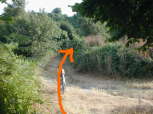 Sulla sinistra , in parte coperta dalla vegetazione, si intuisce l'inizio di una vecchia pista interrotta dopo pochi metri da una frana. Superato di lato lo sbarramento di terra e massi ci si trova su una strada in discesa fra due pareti di tufo. Alla data di percorrenza la vegetazione ancora consente il passaggio senza particolari difficoltà