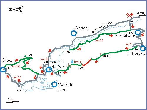Si parte dal bivio della Turanese (km 35.200) per Pozzaglia / Pietraforte. La strada asfaltataprima scende per attraversare il fiume Turano e poi risale aggirando l'abitato di Pietraforte (km 2,5). Senza entrare in paese si percorre una sorta di curva a spirale per poi proseguire in salita