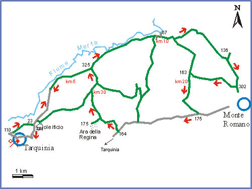In corrispondenza di un cartello indicatore conviene girare a sinistra e seguire le indicazioni per l'Ara della Regina. Dopo 500 m, in corrispondenza di un cartello sulla destra, si oltrepassa un cancello in legno sulla sinistra e si entra nell'area archeologica. |