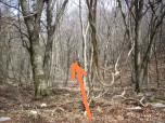 Arrivati ad una radura erbosa si abbandonano i segni bianco rossi che proseguono in salita, si passa accanto ad un grosso albero cavo iniziando a scendere sul versante opposto. Da qui inizia il tratto "a vista" senza alcun riferimento se non seguire la massima pendenza. Lo spesso manto di foglie rende insidioso rimanere in sella. |