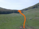 Si prosegue " a vista" su tracce di sentiero e pianori erbosi percorrendo il fondo valle per quasi dieci chilometri fra mandrie di mucche e cavalli. In questo tratto non ci sono riferimenti visivi significativi bisogna pertanto fidarsi del proprio senso di orientamento ( o del GPS). Nei punti dubbi tenersi verso la destra della valle fino ad incontrare i paletti metallici (con cappellotto arancione o triangolo) del metanodotto facendosi poi guidare da questi |